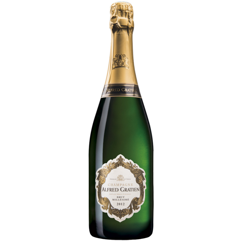 Alfred Gratien - Brut Millésimé 2012 : La campagne 2012 a subi de fortes pressions climatiques. Entre hiver interminable et précipitations, les récoltes furent peu quantitatives. Cependant, les journées ensoleillées de Juillet et Août ont permis une parfaite maturité du raisin, ce qui a offert à la Champagne un millésime aussi surprenant que fabuleux. Servir à 10°C dans une large flûte ou un verre à vin. A table, proposez-lui la compagnie de mets nobles à la chair délicate (bar, maigre, cabillaud, filet de veau ou poularde…) avec un jus de cuisson, et en écartant pour l’accompagnement les végétaux et les racines, afin de ne pas déséquilibrer l’ensemble.