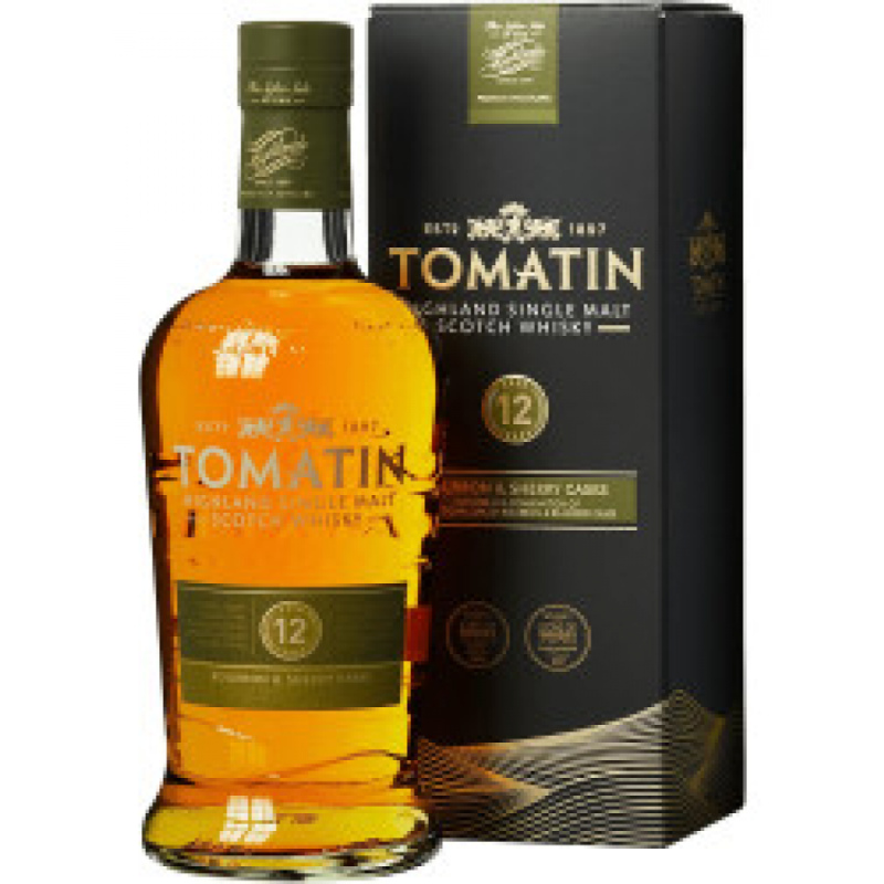 Tomatin 12 Ans - Scotch Wisky : Tomatin 12 ans révèle une douceur et une onctuosité apportée par son vieillissement en anciens futs de bourbon et de sherry. Riche et fruité, il est ensuite marqué par des saveurs sucrées de pommes cuites, de poires et de noix. Sa finale est longue et huileuse.