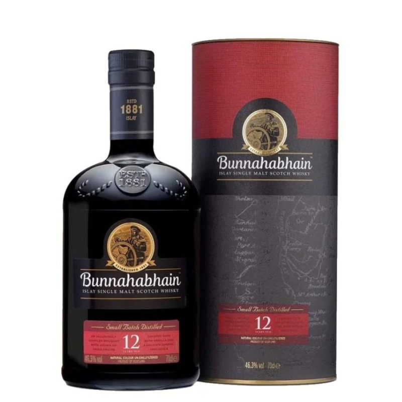 Bunnahabhain 12 Ans Scotch Whisky - Tube : Whisky élevé en fûts de Bourbon et de sherry ce qui lui confère une belle couleur dorée. Ce single malt écossais d'Islay propose un équilibre séduisant de fruits sucrés, de noix, de vanille et une délicate influence côtière avec une belle longue finale. Un whisky incontournable à découvrir. Il est non filtré à froid.