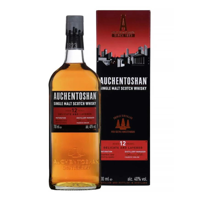 Auchentoshan 12 Ans - Scotch Whisky : Single malt résultant d’une triple distillation. Assemblé à partir de fûts de bourbon et de fûts de sherry (xérès), Auchentoshan 12 ans d'âge développe de gourmandes notes de fruits et de fleurs. Il se caractérise par sa finesse et se révèle être la tête d'affiche de la distillerie Auchentoshan.